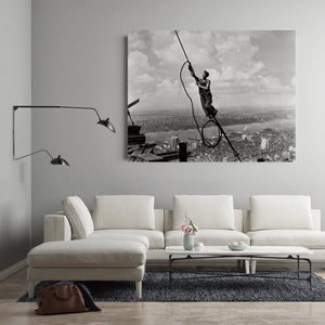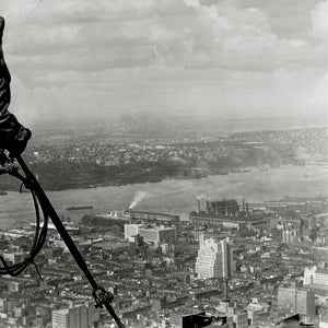 The building of the New York Empire State Building in 1930. Photo taken by Lewis Hine, aptly named "Icarus". Suspended in graceful sangfroid, the steelworker symbolizes daring technical innovation of the sort Daedalus embodied in Greek legend. While Daedulus flew the middle course between sea and sky safely, his son Icarus flew too close to the sun and perished. The optimism of this image suggests that it was not Icarus's folly but his youth and his ability to fly that prompted Hine's title.