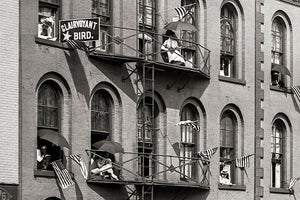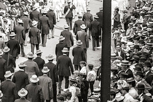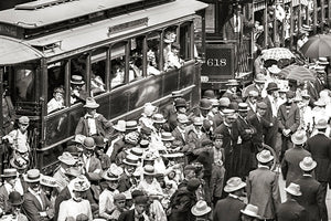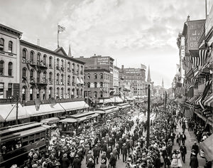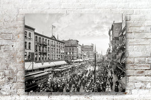 Step into the vibrant celebration of Labor Day in 1900 Buffalo, New York, with this captivating photograph. The streets come alive as a grand parade unfolds, with people lining the sidewalks and eager spectators watching from their apartments above and even from the passing trolley cars.