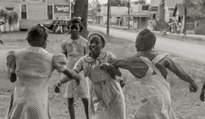 Step into 1938, Louisiana, with this enchanting photograph capturing the innocence and joy of childhood. Enter a world where little girls play on a sidewalk, engaging in a spirited game of Ring-Around-A-Posie, with onlookers in the background.
