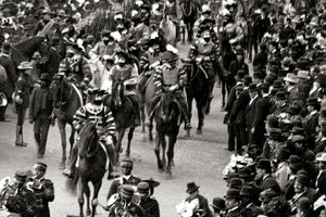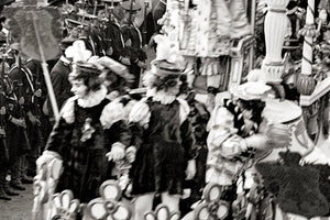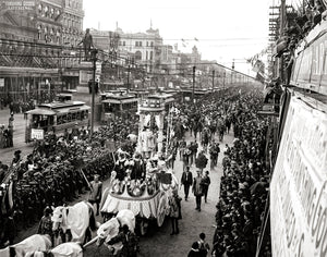 Step into the vibrant streets of New Orleans in 1900, where the spirit of Mardi Gras comes alive in this joyous photograph. Immerse yourself in the excitement of the parade on Canal Street as you witness the grandeur of Rex, The King of Carnival, surrounded by a sea of onlookers.