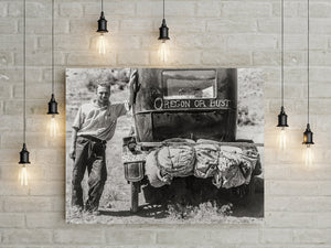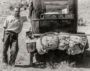 With everything he owns securely tied to the back bumper, the young man's determination is symbolized by the words "Oregon Or Bust" scrawled across the car's surface. This heartfelt expression reflects his hope for a better future and highlights the spirit of those who sought opportunities elsewhere during this difficult period in American history. The photo serves as a poignant reminder of the resilience and determination of individuals facing adversity and their unwavering pursuit of a brighter tomorrow.