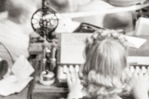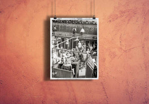 Amidst this bustling activity, a woman captivates attention as she sits at a machine, possibly a telegraph, diligently working to process and relay vital information. Her role in the exchange is a testament to the diverse contributions made by individuals in this bustling marketplace.