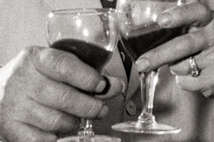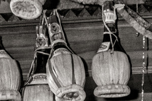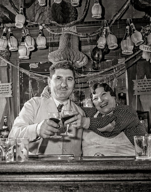 In this delightful scene from Mulberry St., NYC in 1942, the Mr. and Mrs. Di Costanzos can be seen at the bar of their restaurant, sharing a moment of happiness and connection. With their glasses of wine raised high, they clink in celebration of the new year. The ambiance is festive, with old Chianti bottles hanging from the ceiling alongside Christmas decorations, creating a warm and festive atmosphere.