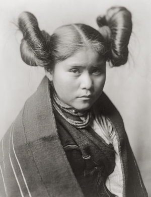 In this heartwarming photograph taken by Edward Curtis in 1906, we witness the timeless beauty of an Indigenous American Tewa Girl. Her hair is meticulously styled in the intricate "Squash Blossom" fashion, showcasing the artistry and cultural significance of indigenous hairstyling traditions. Adorned with beads around her neck and wearing a shawl, her grace, and distinctive cultural identity allow us a glimpse into her rich traditions.