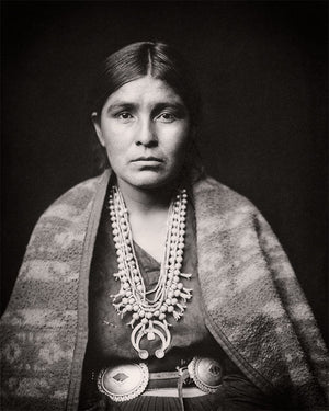 This portrait by renowned photographer Edward Curtis, taken in 1905, showcases a young Navajo American Indian woman. Adorned with intricate beads and silver jewelry, including a stunning Concho belt, she wears a finely woven blanket as a shawl, symbolizing the cherished traditions and craftsmanship of the Navajo community.