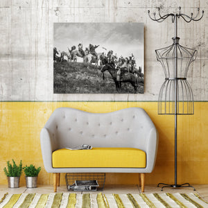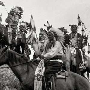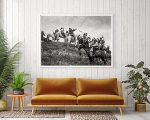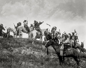 This Edward Curtis print, taken in 1907, depicts a group of Native Americans from the Ogalala Sioux tribe on horseback. Dressed in magnificent traditional attire and adorned with majestic headdresses, they exude a sense of cultural pride and heritage. The composition captures the group on a hill, overlooking the picturesque valley of Wounded Knee Creek, located on the Pine Ridge Reservation in South Dakota. One member of the group is seen pointing towards something beyond the hill, adding a sense of intrigue and anticipation to the scene. The photograph beautifully encapsulates the spirit, and unity of the Ogalala Sioux people, serving as a powerful representation of their rich history and connection to the land.