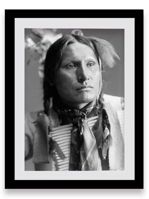 Presenting a remarkable portrait of "Samuel American Horse," a distinguished Indigenous American hailing from the Pine Ridge Reservation in Shannon County, South Dakota. This photograph captures "Samuel American Horse" exuding an air of pride, his gaze directed subtly towards the left. Adorned with feathers in his ear and dressed in traditional clothing, he embodies the cultural heritage and deep-rooted traditions of the Oglala Lakota people.