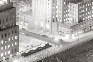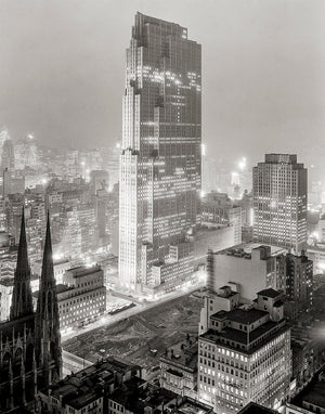 Teleport back to the vibrant streets of 1930s New York City with this gorgeous nighttime photo. Taken from the vantage point of 515 Madison Avenue, it offers a breathtaking view of the iconic Rockefeller Center and the magnificent RCA Building.