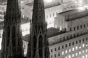 The bustling cityscape comes alive as you gaze upon this snapshot in time. The towering structure of Rockefeller Center with its sleek architecture and grandeur represents the ambition and innovation of the era. The RCA Building, with its art deco design and distinctive spire, is a striking focal point in the composition.