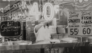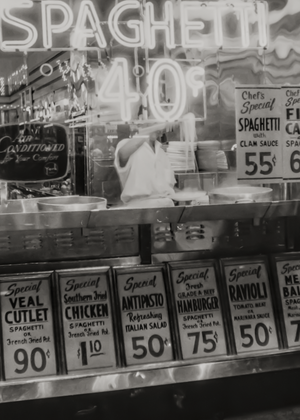 Step back in time with this historical photograph from NYC, 1957. This iconic black and white shot features a man holding up a forkful of spaghetti. He is framed by a buzzing neon sign in the foreground that simply reads, "Spaghetti. 40 Cents". This piece not only serves as a nostalgic trip to the past but also as an artistic expression of the ambiance and charm that defined 1950s America in Little Italy, New York.