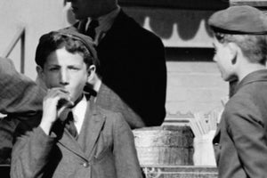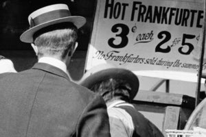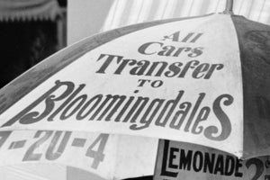 Discover the early origins of food trucks in New York City with this remarkable historical photograph from the early 1900s. Positioned outside Frances Draz & Company, these two horse-drawn food "trucks" serve as vibrant hubs of culinary delights. With workers sheltered under umbrellas adorned with advertisements for Bloomingdales and Young's Hats, they offer a tempting array of fare, including 3-cent frankfurters (or 2 for 5 cents), lemonade, and more. As customers seek a delicious meal, pedestrians traverse the busy sidewalks, creating a lively atmosphere at this corner of NYC.