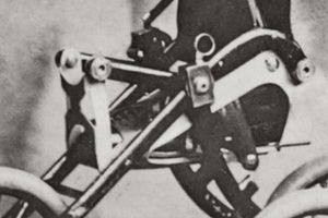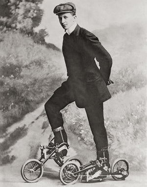 Take a look at these vintage roller skates! In this full-length portrait, a gentleman strikes a pose while showcasing his stylish attire. Sporting a hat, jacket, and pants, he exudes a timeless charm. The roller skates themselves are a fascinating sight, reminiscent of small bicycle wheels with spokes, cleverly supported mid-calf. This photograph was captured in 1910, and offers a delightful glimpse into the fashion and recreational trends of the era.