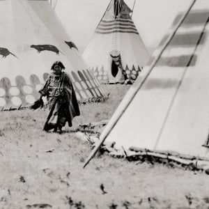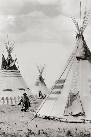 In 1913, Roland Reed captured a compelling photograph titled "Blood Camp." The image features a woman adorned in traditional attire gracefully strolling amidst three tipis. Notably, one of the tipis is specifically designated for women to visit on a monthly basis.