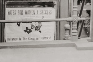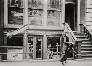 A woman gracefully walks in the foreground, symbolizing the determination and progress of the suffrage movement. The Headquarters of the Congressional Committee, situated on the lower level, proudly displays a sign in the window that reads, "Votes For Women Are a Success, Imitation Is The Sincerest Flattery." Seven years after this photograph was taken, they finally succeeded in securing the vote.