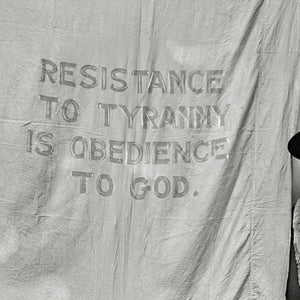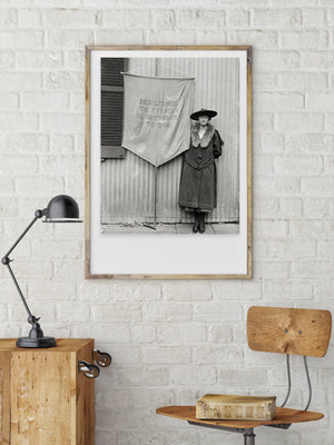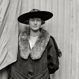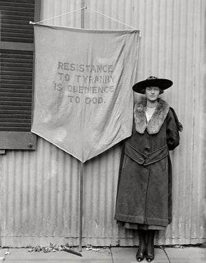 In 1914, six years before women got the right to vote, Helen Hitchcock takes a courageous stand for equal rights and justice. In this captivating photograph, Helen Hitchcock boldly wears a coat with a fur collar and a hat and holds a banner high, bearing the powerful words, "Resistance to Tyranny is Obedience to God." Her choice of message reflects a deep belief in the inherent rights and dignity of all individuals, emphasizing the importance of challenging oppressive systems for the greater good.