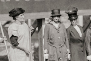 In this powerful image, the dedicated members of the party stand side by side, united in their mission for equal rights. Each woman is a symbol determination. Their names are forever etched in history, alongside their unwavering commitment to the suffrage movement. Pictured left to right are Rene Glogan, Helena Ries, Mrs. J.N. Dawson, Mrs. M. Barnes, Rose De Bella, Mrs. Daniel Appleton Palmer, Mrs. Thomas B. Wells, Mary Garrett Hay and Flora Hay.