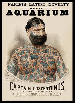 Step into the intriguing world of a historical advertisement promoting a Farini exhibition in London. The spotlight shines on Captain Costentenus, an enigmatic figure hailed as a "Greek Albanian!" The ad proudly boasts that he is entirely tattooed from head to foot, the intricate designs etched upon his skin as a punishment for his involvement in a rebellion against the King. This fascinating piece hails from the esteemed collection of the Wellcome Library in London.