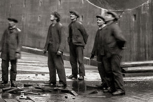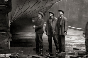 Amidst the scene, a group of men gaze upward, their eyes fixed on the towering ship above them. Their presence underscores the magnitude of the undertaking and the awe-inspiring nature of the Titanic's construction.