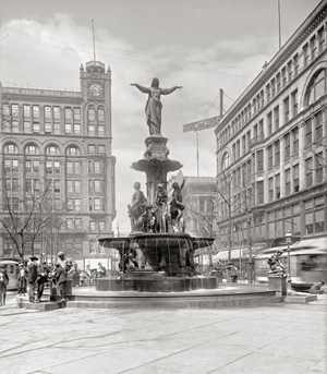 The Tyler Davidson Fountain, a celebrated landmark in Cincinnati, Ohio, was dedicated on October 6, 1871, and stands as an iconic symbol in the city's downtown area, located in Fountain Square. It was generously donated by Henry Probasco in memory of his brother-in-law and business partner, Tyler Davidson. The fountain's design, crafted by German artist August von Kreling and Ferdinand von Miller, is themed "The Genius of Water" and features a female figure at the top, symbolizing water's life-giving properties, surrounded by figures representing its various uses. Made primarily of bronze, its intricate design is a testament to 19th-century artistry and foundry work. The Tyler Davidson Fountain has become a beloved symbol of Cincinnati, often featured in films and promotional materials, and serving as a popular gathering spot. Its historical significance and beauty are maintained through periodic restorations, underscoring the city's commitment to preserving its landmarks. Accessible to the public, the fountain continues to be a central part of community events and a focal point in the urban landscape of Cincinnati.