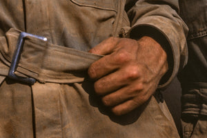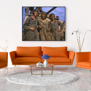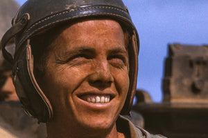 Step into a vivid moment captured in a Kodachrome photograph from 1942, as M-4 Tank Crews return from a mission. The image, expertly taken by Alfred Palmer, portrays a heartwarming scene where three young men radiate joy and relief upon their homecoming.