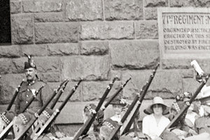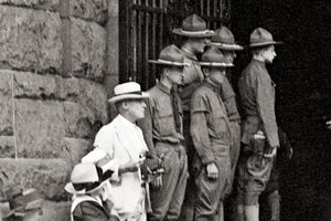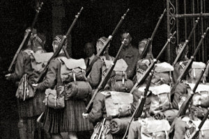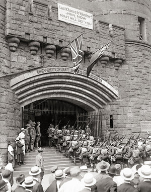Welcome Canadian Highlander soldiers (Kilties)! In this photo, they're entering the 71st Regiment Armory, Park Avenue (between East 33rd and 4th streets), New York City. The Highlander regiments were in the United States in July of 1917 for "British Recruiting Week" which encouraged enlistment in World War I. July 22, 1917.