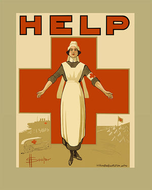 At the top of the poster, the word "HELP" commands attention in large, impactful letters, conveying a sense of urgency and the critical nature of the Red Cross mission. The red cross itself, a symbol of humanitarian aid and support, stands prominently against a light yellow background, creating a visually striking contrast.