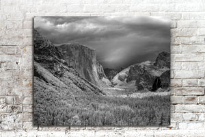 Witness the dramatic beauty of Yosemite National Park in California through the lens of acclaimed photographer Carol Highsmith in 2013. This photograph captures a brilliant and moody moment as storm clouds sweep across the landscape.